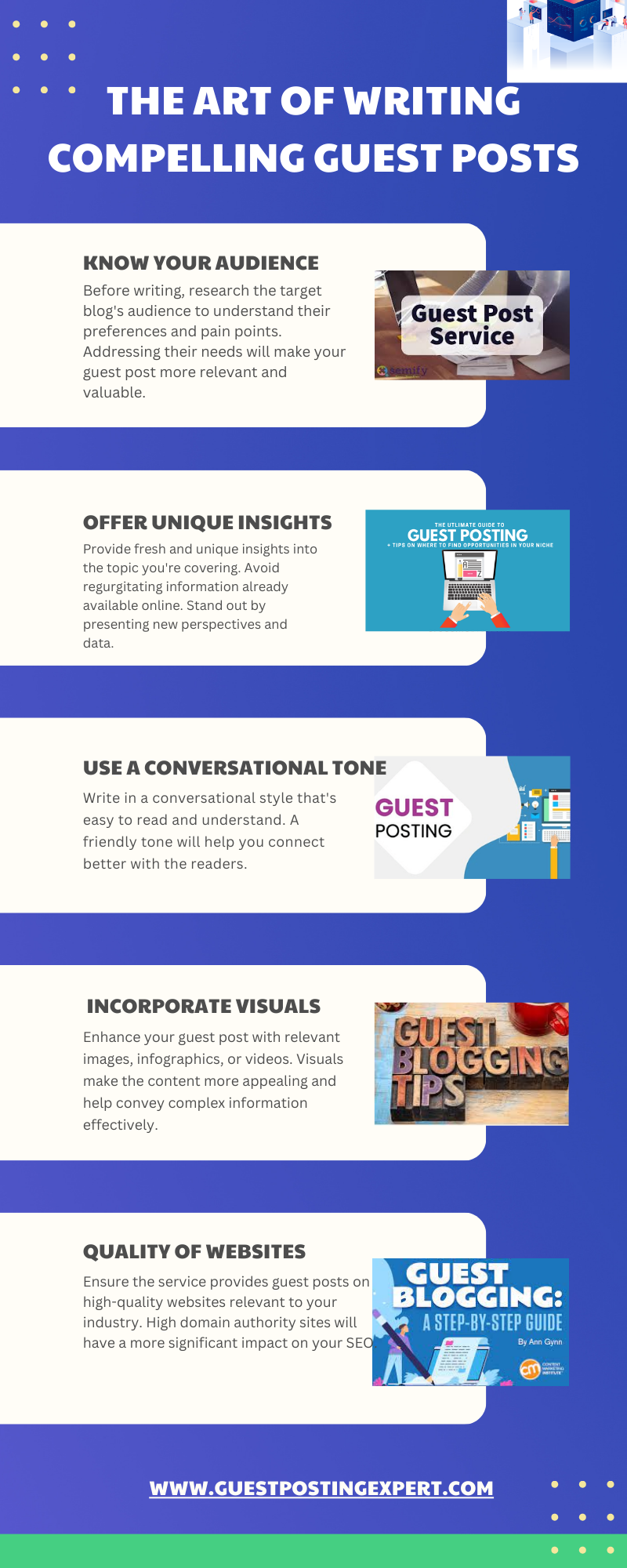 Enhance the visual appeal of your guest posting sites USA by including relevant images, infographics, or videos. Visual elements not only make the content more engaging but also improve its shareability on social media.